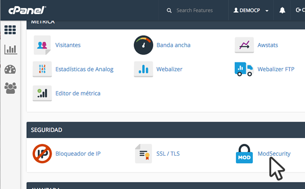 Debe navegar al apartado Seguridad y hacer clic en ModSecurity.