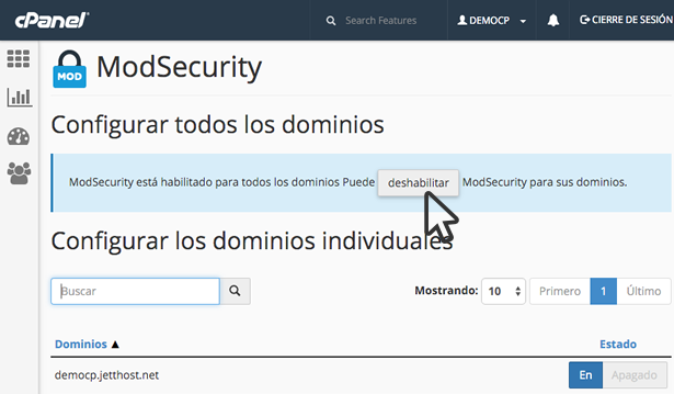 Para activar o desactivar Mod_Security para sus sitios web debe seguir los siguientes pasos: