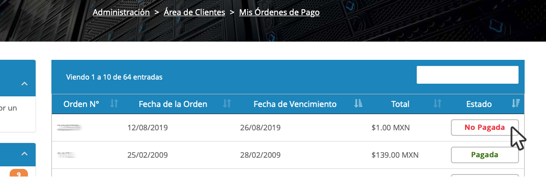Dentro de su área de cliente debe hacer clic en órdenes de pago.
