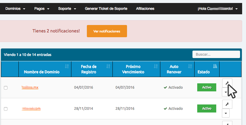 Se va a mostrar un listado con sus Dominios, debe hacer clic sobre la herramienta del Dominio que desea modificar.