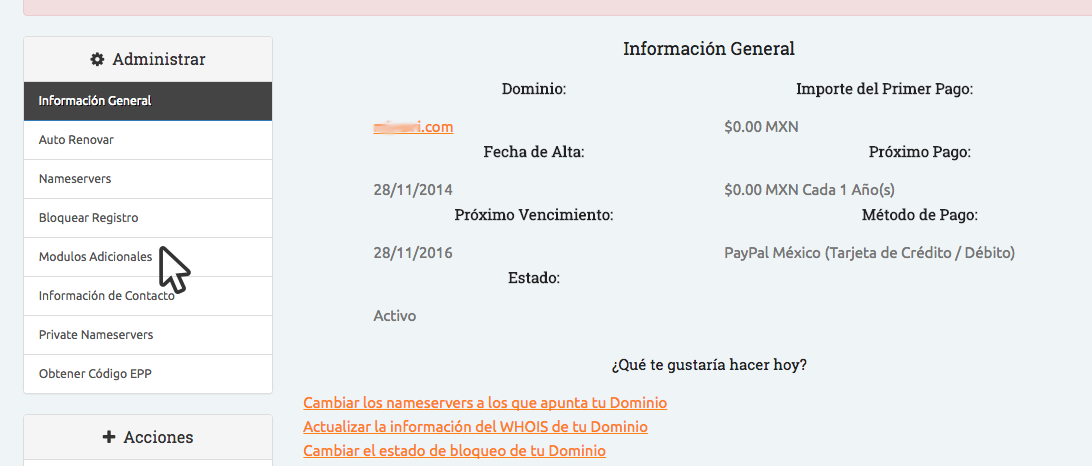 Para contratar servicios adicionales para su dominio, debe seguir los pasos mostrados a continuación: