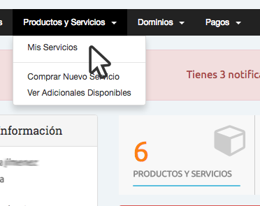 Dentro de su área de cliente debe hacer clic en Productos y Servicios -> Mis Servicios.