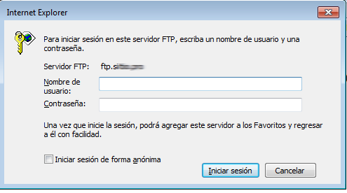 Ingrese su usuario FTP y su contraseña en el cuadro de diálogo correspondiente, tal y como se la enviamos por correo electrónico al activar su plan.