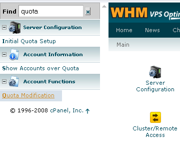 Puede suceder que en algún momento una cuenta que hayamos creado esté con la capacidad de espacio en disco llena. Para modificar el espacio en disco de una cuenta ponemos: “Quota Modification” en el buscador del WHM.