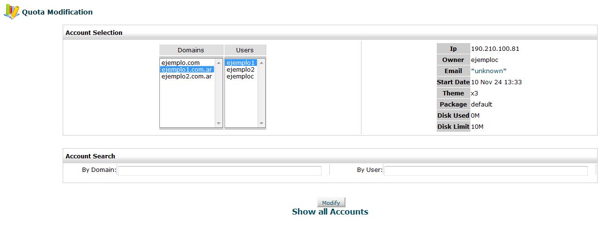 Nos aparecerá un recuadro con todas las cuentas que tenemos creadas en nuestro servidor. Ahora tenemos que seleccionar el dominio de la cuenta que deseamos modificar y hacemos clic en “Modify”