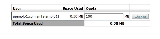 Allí podemos asignar la cantidad de MB que queremos darle a la cuenta. Si queremos que el espacio sea ilimitado ponemos “UNLIMITED”, Presionamos “Change” y listo.