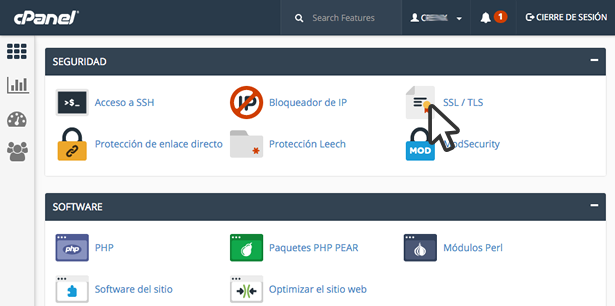 Debe navegar al apartado Seguridad y posteriormente hacer clic en SSL/TLS.