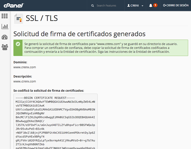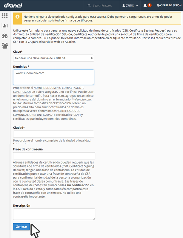 ¿Cómo puedo generar la solicitud de firma de certificado CSR en cPanel? Imprimir